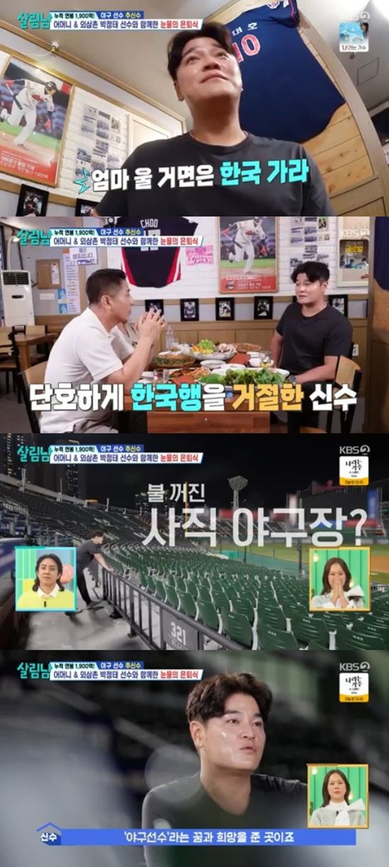 추신수는 "한식당에 가서 엄마가 울면서 한국으로 가자고 했다. 그래서 내가 '엄마 울 거면 한국 가라. 내가 선택한 거다'라고 했다"며 어머니의 한국행 제안을 거절했다고 했다.