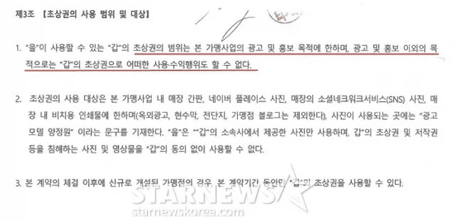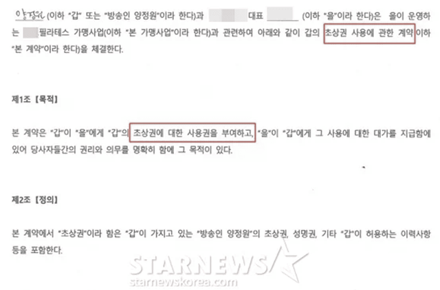 이 계약서에는 '광고 및 홍보 이외의 목적으로는 양정원의 초상권을 어떠한 사용, 수익 행위도 할 수 없다'고 명시되어 있었는데, 'C사가 가맹점 계약을 체결할 시 양정원이 해당 가맹 사업의 영업, 운영에 관여하지 않는다는 점을 설명해야 한다'는 내용도 계약서에 포함돼 있었던 만큼 많은 이들의 시선이 집중되었습니다.