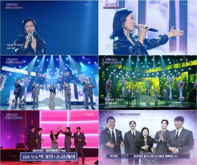 박기영은 ‘손에 손잡고’를 본인만의 색으로 재해석하면서도 특유의 폭발적인 라이브에 관객들의 마음을 촉촉하게 만드는 섬세함을 더한 목소리로 무대를 꽉 채웠다. 박기영과 송클레어의 압도적인 무대에 관객들 역시 기립박수로 화답했고 이들의 무대를 지켜본 MC 이찬원을 비롯한 출연진들은 경쟁을 잊고 이들의 무대에 감탄과 존경을 보내왔다.