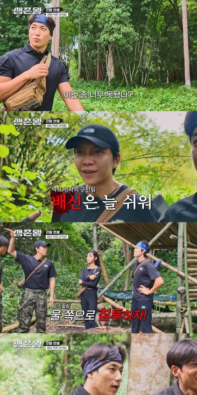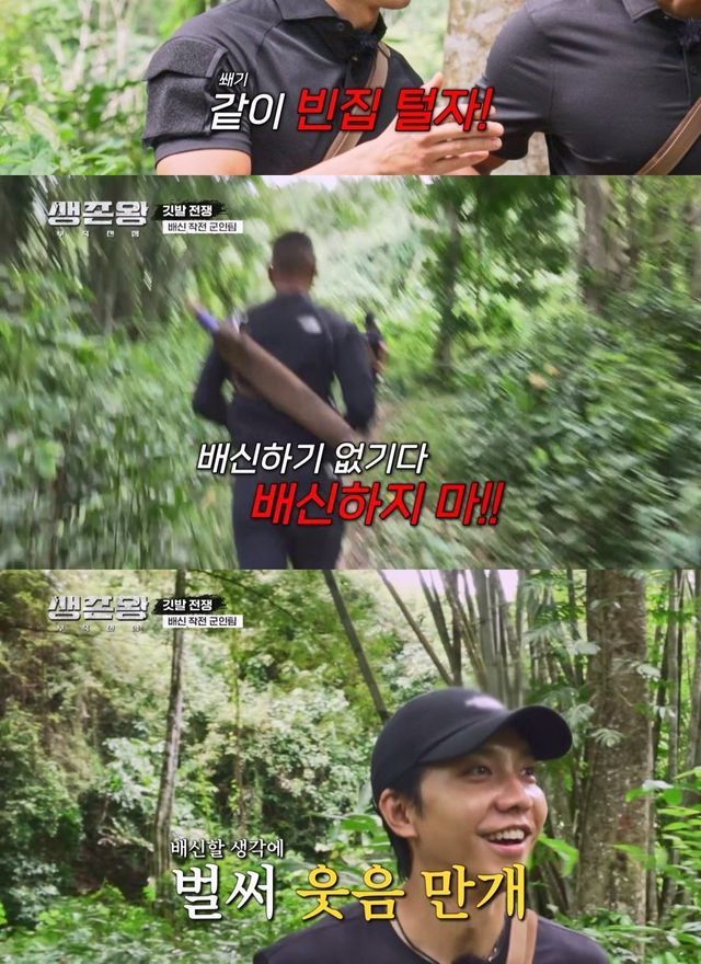 ‘군인팀’ 이승기X강민호X아모띠는 지리적으로 ‘피지컬팀’과 ‘국가대표팀’ 양쪽의 위협을 받을 수 있는 상황에서 국가대표팀과 연합을 결정했다. 연합을 위해 국가대표팀 생존지로 가던 중 강민호는 “이건 좀 너무 못됐나?”라며 은밀히 국가대표팀에 대한 ‘배신 작전’을 세웠다. 확실한(?) 필승 전략에 이승기는 “배신은 쉽다. 앞으로 신뢰 회복이 어려울 뿐이다”라며 잠시 고민했지만, 생존을 위해 ‘배신’을 선택했다.