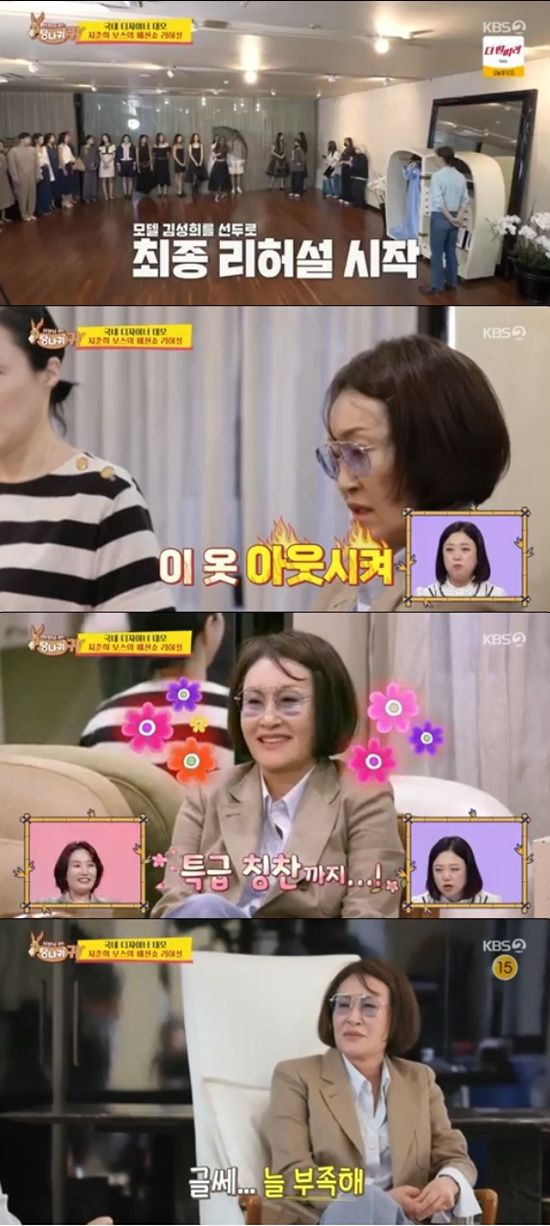 지진희 팀장은 자신이 디자인한 의상이 나오자 긴장을 했다. 지춘희는 지진희 팀장의 옷을 보고 "예쁘다"고 칭찬을 해줬다.