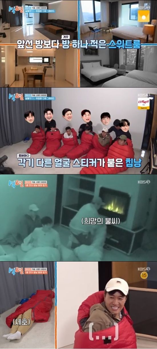 멤버들은 일단 침낭 안으로 들어갔다. 이어 제작진이 멤버들의 침낭에 멤버 얼굴 스티커를 붙였다.