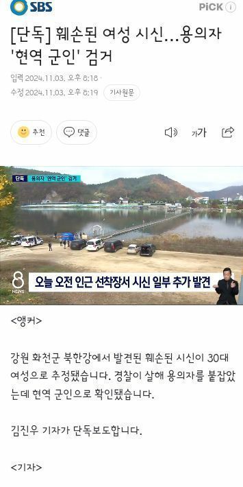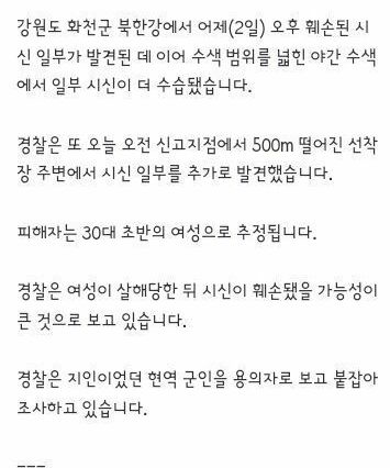 화천 북한강 30대여성 시신 훼손 사건 유력 용의자 현역군인 검거,,