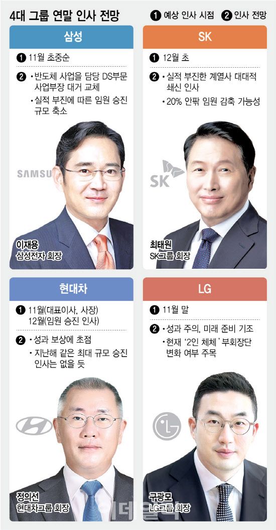 LG그룹은 상대적으로 조직 안정에 무게를 둘 가능성이 크다. LG그룹은 이번달 말 임원 인사를 할 예정이다. LG그룹은 현재 권봉석 ㈜LG 부회장과 신학철 LG화학(051910) 부회장의 2인 체제인 부회장단의 변화 여부에 관심이 모아진다. 일부에서는 조주완 LG전자(066570) 대표이사 사장의 부회장 승진 가능성이 있다는 관측이 나온다.