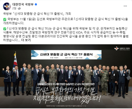 국방부는 1일 김선호 국방부 차관 주관으로 신세대 맞춤형 군 급식 혁신 TF 출범식을 개최했다고 밝혔다.