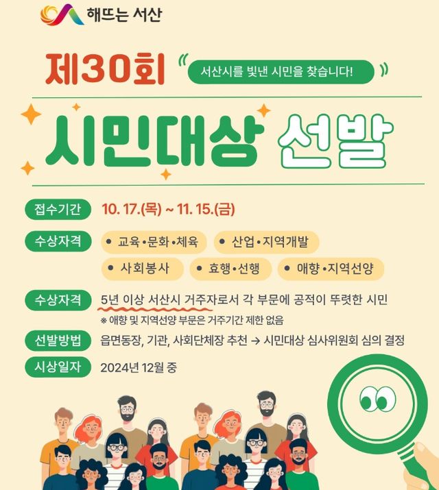 한편, 서산시 시민대상에 대한 자세한 사항은 서산시 자치행정과 또는 읍면동 행정복지센터에 문의하면 된다.
