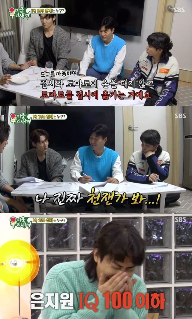 드디어 입회 테스트 결과를 확인한 세 사람. “IQ 100이 안 되면 미우새 말고 동물농장에 출연하자”라던 은지원의 IQ를 확인한 세 사람은 박장대소했고, 마지막으로 ‘바보들의 희망’이 된 김종민이 떨리는 마음으로 결과를 확인했다. 김종민 역시 불합격했지만, 세 사람 중에는 가장 높은 IQ를 받아들고 기뻐했다.