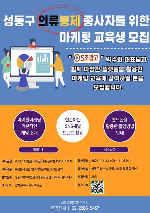 교육은 11월 8일부터 29일까지 성동스마트패션센터(왕십리로21나길 5, 4층)에서 매주 금요일마다 진행되며, 소셜네트워크서비스(SNS)의 이해와 숏폼 콘텐츠 제작 등 마케팅 역량 강화를 위해 소상공인 전문 교육기관 '5초 광고'의 박수화 대표가 강사로 나선다.