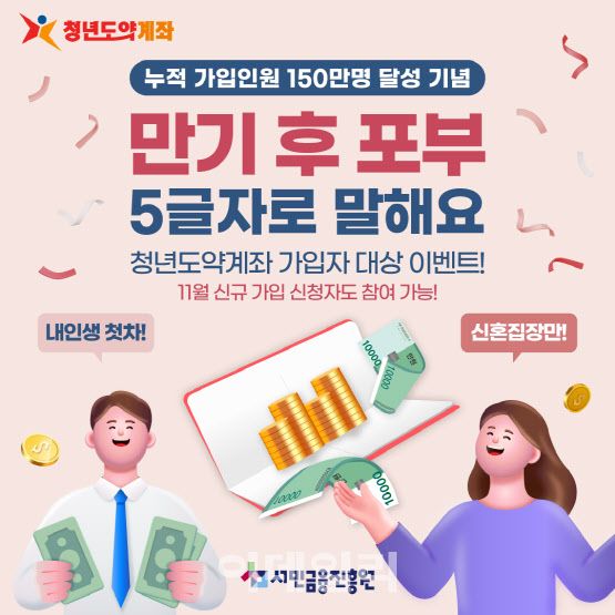 서금원은 청년도약계좌 누적 가입인원 150만명 달성을 기념해 18일까지 ‘만기 후 포부 5글자로 말해요’ 이벤트를 청년도약계좌 가입자를 대상으로 진행한다.