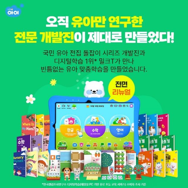 리뉴얼 된 밀크T아이는 국민 유아 전집이라고 불리는 ‘돌잡이 시리즈’ 개발진 및 공교육 현장을 경험한 개발진이 함께 기획 및 분석, 수정까지 무수한 과정을 거쳐 탄생시킨 결과물이다.