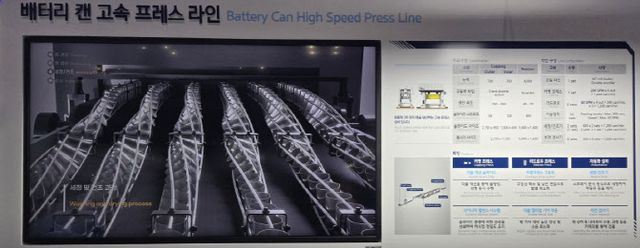 이날 추가적으로 관람객들의 눈길을 사로잡은 제품은 ‘배터리 캔 프레스 라인’이다. 이 제품은 분당 최대 200회 성형이 가능하며, 음료 등 각종 캔을 비롯해 전기차용 원통형 배터리 ‘캔’을 생산할 수 있다.