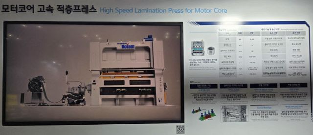 현장 부스 관계자는 “‘모터코어 고속 적층 프레스’ 기술개발은 올해 상반기 마무리 된 상황이며 시제품을 모터코어 제조업체 코아오토모티브에 최근 전달했다”며 “장비를 공급받은 코아오토모티브가 모터코어 양산 테스트를 진행한 후 이에 대한 큰 문제가 없으면 관련 장비가 공급될 예정”이라고 말했다.