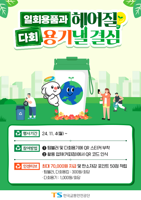 [내외일보] 이수한 기자 = 한국교통안전공단(이사장 정용식, 이하 TS)은 임직원과 지역 주민을 대상으로 4일(월)부터 생활 속 녹색 실천 캠페인 ‘(일회용기와)헤어질, (다회)용기낼 결심’을 시행한다고 밝혔다.