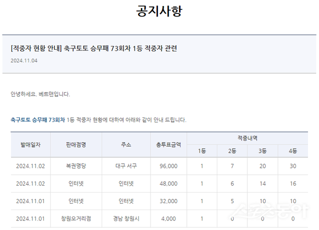 공식 인터넷 발매 사이트 베트맨이 4일(월) 발표한 적중 결과에 따르면, 축구토토 승무패 73회차에서 14경기 결과를 모두 맞혀야 하는 1등 적중은 총 4건이 발생했다. 이에 따라 1등 적중에 성공한 4건은 각각 1억5304만7000원을 받을 수 있다.