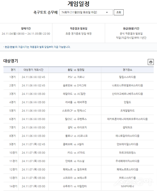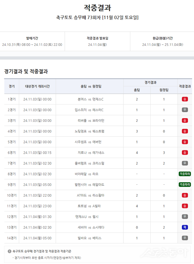 ●축구토토 승무패 73회차, 홈팀의 승리 주로 이어져…14경기 중 2개 경기는 스페인 호우 피해로 인한 경기 연기로 적중특례