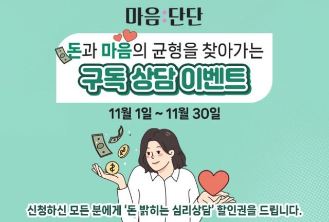 이번 이벤트는 돈 때문에 우울감을 호소하는 사람들을 대상으로 11월 1일부터 한 달 동안 진행하며, 구글폼을 통해 간단한 신청서를 제출하면 구독상품을 이용할 수 있는 할인 쿠폰을 제공한다.