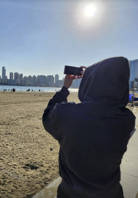 바다를 배경으로 포즈를 취하고 있는 김수현은 후드를 뒤집어쓰고 마스크로 가렸으나 긴 팔다리와 작은 얼굴이 정체를 그대로 드러내고 있다.