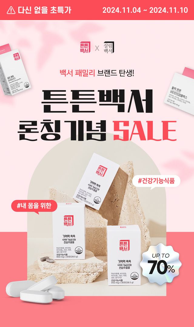글로벌 라이프케어 기업 뉴온이 건강기능식품 브랜드 튼튼백서 론칭을 기념해 10일까지 인기 제품을 최대 70% 할인 판매하는 프로모션을 연다고 4일 밝혔다.