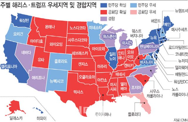 네브래스카와 메인만 투표율로 선거인단을 정하고, 이외 각 주(州)의 최다 득표자는 주에 배정된 선거인단 전원을 가져갈 수 있다. 이른바 승자 독식제다. 올해 대선에서 미국 50개 주와 워싱턴D.C에 분배된 선거인단의 총수는 538명으로, 이중 과반인 270명 이상을 확보해야 승리할 수 있다. ‘매직넘버 270의 법칙’으로도 불리는 이유다.