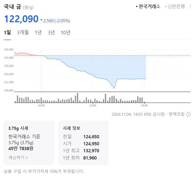 국내 금시세(금값)가 4일 오후 하락세(전 거래일 대비)를 보이고 있다.