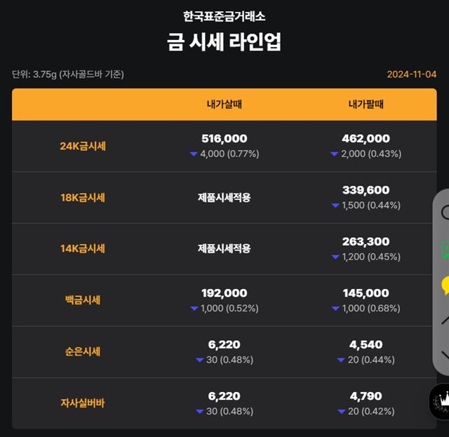 순금(24K) : 매입가 51만 1000원 / 매도가 46만 4000원
