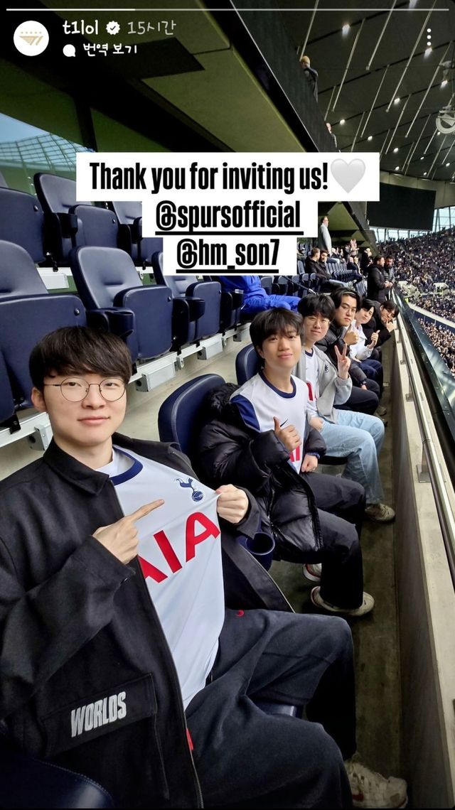 손흥민의 초청에 T1 선수단도 응했다. 페이커를 비롯한 T1 선수단은 3일 열린 토트넘-애스턴 빌라전에 토트넘 유니폼을 입고 직관했다. 선수단은 소셜 미디어(SNS)에 해당 사진을 게재하며 토트넘과 손흥민의 초청에 감사하다는 메시지도 남겼다.