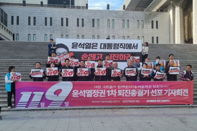 전국민주노동조합총연맹, 한국진보연대 등 50여 개 단체가 참여한 윤석열정권퇴진운동본부는 4일 서울 광화문 세종문화회관계단에서 기자회견을 열고 "10만 국민들이 함께한다"며 "11월 9일 퇴진총궐기와 국민촛불을 통해 윤석열 정권 퇴진광장을 열자"고 외쳤다.