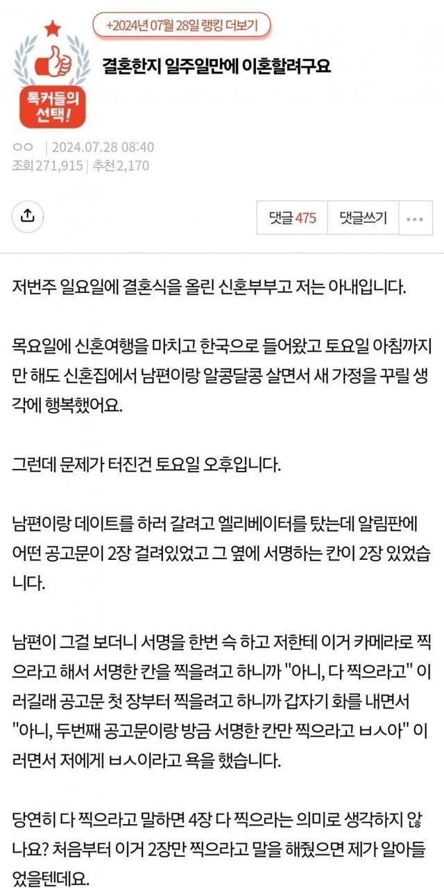 결혼 일주일 만에 남편한테 ㅂㅅ 소리 들으면 이혼할만 하지