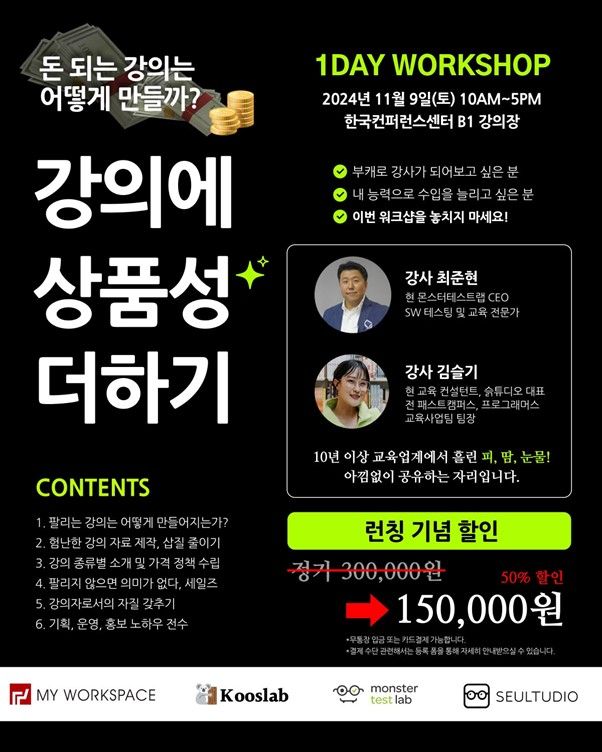 강의는 강남역 5번 출구 근처 마이워크스페이스 지하 컨퍼런스 룸에서 열린다. 현재 정가 30만원에서 15만원으로 런칭 할인 이벤트 중이다. 관심 있는 일들은 아래 링크를 참조하면 된다.
