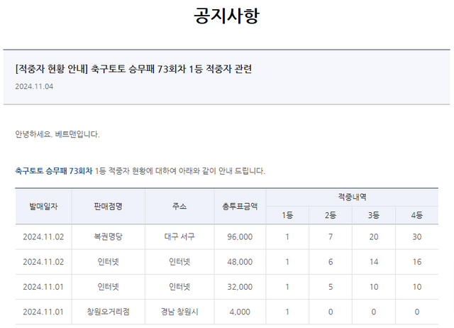 공식 인터넷 발매 사이트 베트맨이 11월 4일 발표한 적중결과에 따르면, 축구토토 승무패 73회차에서 14경기 결과를 모두 맞혀야 하는 1등 적중은 총 4건이 발생했다. 이에 따라 1등 적중에 성공한 4건은 각각 1억 5,304만 7,000원을 받을 수 있다.
