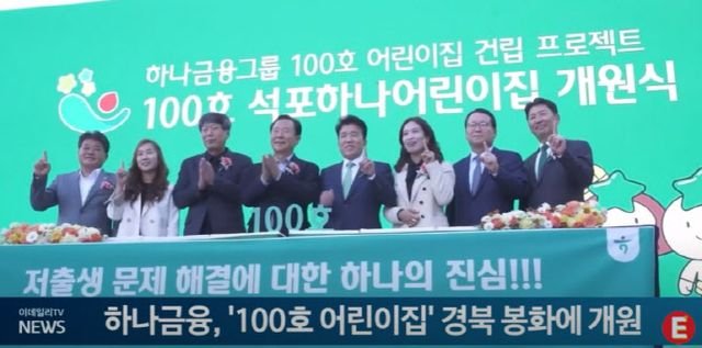 하나금융은 지난달 31일 경상북도 봉화군에서 ‘100호 어린이집 건립 프로젝트’의 100번째 어린이집인 ‘국공립 석포하나어린이집’ 개원식을 열었다고 오늘(4일) 밝혔습니다.