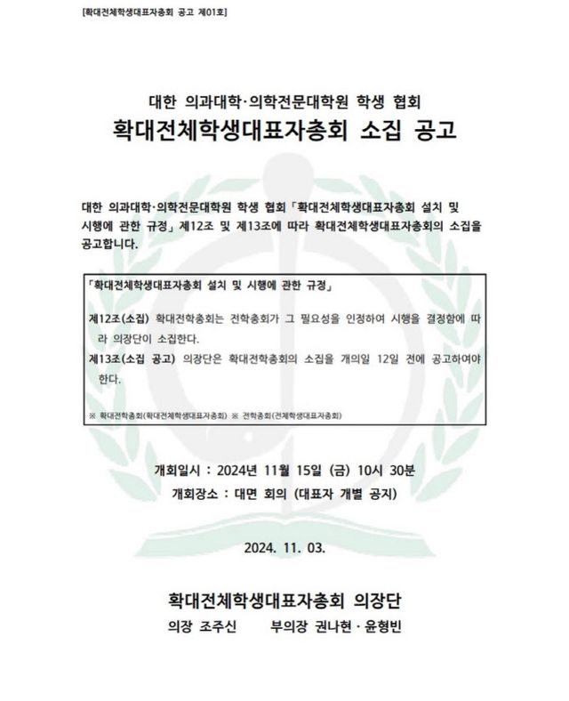 4일 의대협은 “지난 달 19일 의대협 전체학생대표자총회는 2025학년도 협회 방향성 논의를 위해 임시의결기구인 확대전체학생대표자총회 설치·시행을 결정했다”고 밝혔다.