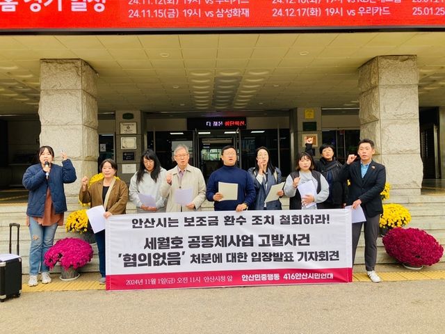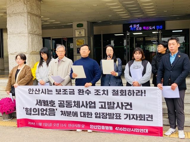 안산민중행동과 4.16안산시민연대는 기자회견문을 통해 “앞으로 이런 사건이 반복되지 않기를 바란다”며 “세월호 참사 후 지역사회 공동체 회복에 앞장선 지역의 단체들을 격려하고 보호하는 것이 아니라 근거 없는 허위사실 마녀사냥에 동조한 안산시는 사과와 함께 서둘러 보조금 환수조치 철회를 즉각 시행할 것을 요구한다”고 성토했다.