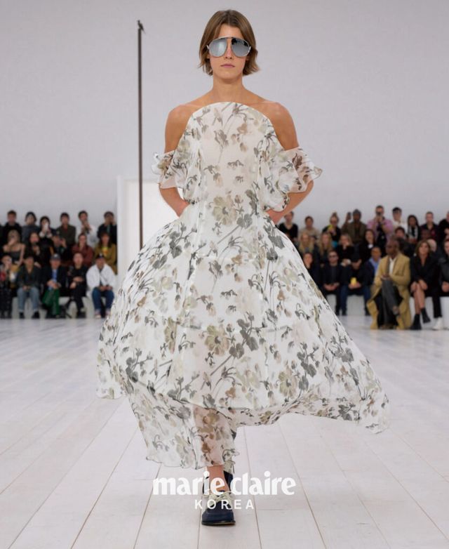 2 ANNIVERSARY SONG 브랜드 창립 연도인 ‘Loewe 1846’이 새겨진 황금 반지를 초대장으로 보낸 조나단 앤더슨. 쇼장 외부에는 거대한 악보 형태의 구조물을 세웠고 컬렉션 곳곳에는 바흐, 모차르트, 쇼팽의 초상화가 프린트되어 있었다. 다양한 형태로 변주된 크리놀린 드레스는 걸음에 맞춰 나풀거리며 쇼에 리듬감을 불어넣었다. 올해 부임 10주년을 맞은 조나단 앤더슨이 그 나름대로 고요히 부른 축가 같던 컬렉션.