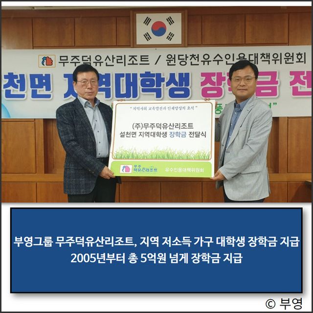 부영그룹 무주덕유산리조트는 매년 무주 설천면 내 저소득 가구 대학생 총 40명을 선정해 1인당 100만원씩 상‧하반기에 나눠 장학금을 지급하고 있다. 지난 2005년부터 지금까지 520여 명의 지역 인재들이 총 5억원이 넘는 장학금 혜택을 받았다.