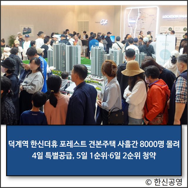 지난 1일 한신공영(004960)이 제시한 경기 양주 '덕계역 한신더휴 포레스트' 견본주택에 주말까지 사흘간 8000여명이 몰리며 인기를 실감케 했다.
