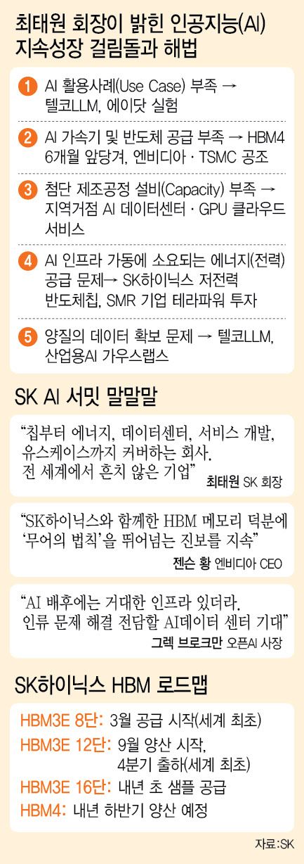 유경상 SK텔레콤 부사장(CSO)은 “AI를 하고 싶어도 엔비디아 GPU를 구할 수 없거나 너무 비싸 AI 산업을 못하는 경우가 너무 많다”면서 “저희가 엔비디아, TSMC 3자 동맹을 통해 싸고 좋은 AI반도체를 만들고자 하지만 이것만으로는 부족한 게 사실”이라고 말했다. 유 부사장은 “최대한 HBM을 열심히 만들고 있지만, 칩이 있다고 하더라도 다음 문제는 데이터센터”라면서 “칩은 아마 몇 년 내에 괜찮아 질 것이고, 몇년 내에 정말 심각해질 문제는 에너지 문제, 데이터센터 문제라고 생각하고 저희는 이를 풀기 위해 다른 기업과 협업하고 있다”고 말했다.