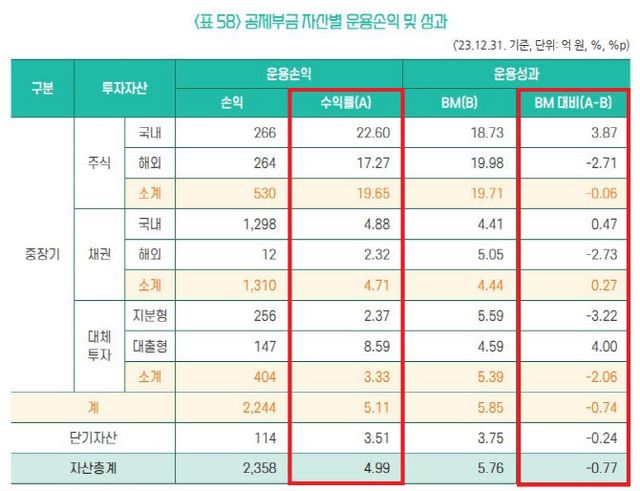 대체투자의 경우 지분형(2.37%)은 글로벌 고금리 장기화에 따른 부동산 평가액 하락 등으로 목표수익률 및 BM을 모두 밑돌았다.