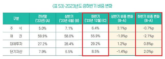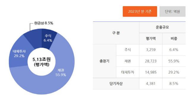 이어 작년 하반기에는 긴축 장기화 우려에 따른 주가 하락에 대응해서 주식 비중(6.4%)을 상반기 대비 0.7%p 축소했다. 또한 대체투자 비중(29.2%)을 상반기 대비 0.8%p 확대하는 등 급변하는 시장상황에 대응해서 운용수익을 높였다.