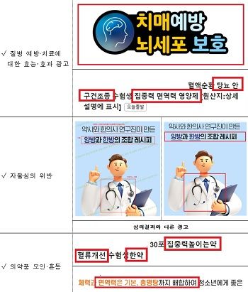 주요 적발 사례는 ▲일반식품을 ‘기억력 개선 영양제’ 등 건강기능식품으로 오인·혼동하게 하는 광고, ▲‘집중력 향상’ 등을 내세운 거짓·과장 광고, ▲질병 예방·치료 효능이 있는 것처럼 표현한 광고, ▲건강기능식품 자율심의를 위반한 광고, ▲집중력 높이는 ‘약’ 등 의약품으로 오인·혼동하게 하는 광고 등이다.