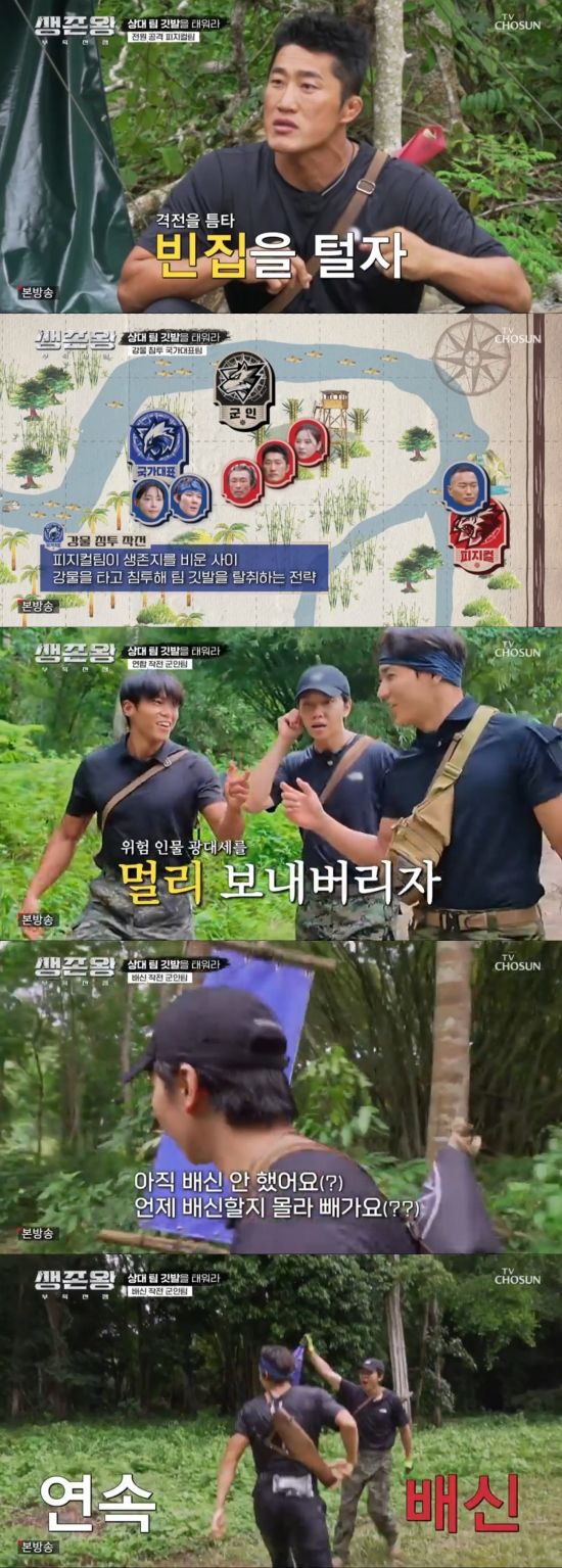 군인팀은 국가대표팀과 연합 작전을 펼치기로 했다. 그러나 군인팀의 속셈은 국가대표팀을 배신하는 것이었다. 국가대표팀은 영문을 모른 채 연합 작전에 응했고, 이후 이승기는 국대팀 깃발을 몰래 획득했다. 이승기는 "아직 배신 안 했다. 배신을 언제 할지 모르니까 빼가는 거다"라며 너스레를 떨었다.