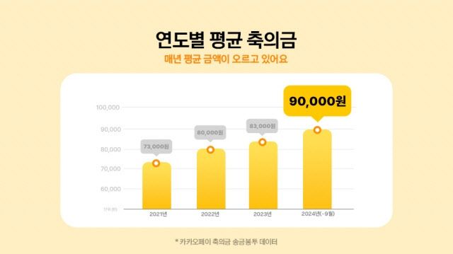 이어 카카오페이는 축의금 송금봉투 데이터를 통해 분석한 연도 및 연령별 평균 축의금 변화도 공개했다. 실제 올해 9월 기준 평균 축의금 비용은 9만원으로, 2021년 7만3000원 대비 약 23% 증가했다. 또한, 연령별 평균 축의금은 20대가 약 6만원, 30~40대가 10만원, 50~60대가 12만원으로 나타났다.