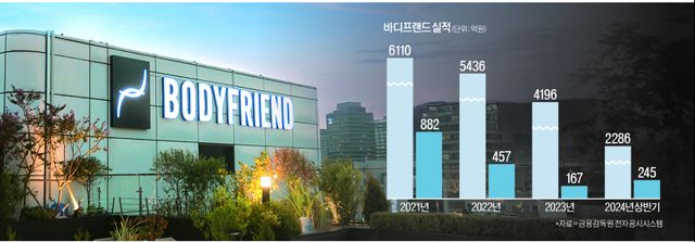 금융감독원 전자공시시스템에 따르면 바디프랜드의 매출은 2021년 6110억원을 기록한 뒤 2022년 5436억원, 2023년 4196억원으로 계속해서 하락 중이다. 영업이익도 같은 기간 882억원에서 457억원으로 반토막 나더니, 지난해 167억원으로 또 한 번 반토막이 났다.