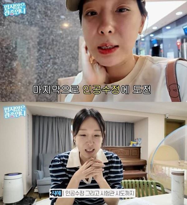 그는 "인공수정이나 시험관 모두 저는 최선을 다했다고 생각한다. 당장 시도할 수 있는 건 아니라 생각할 시간이 있다고는 하는데 다시 또 준비를 할 것 같지는 않다"며 포기를 알린 뒤 "그래도 좋은 결과였으면 했다. 욕심이 너무 났는데 그냥 내 욕심이었구나 싶더라. 인생이 어떻게 다 내 마음대로 되겠나. 있는 것에 감사하자는 생각을 가지려고 하는데 잘될지는 모르겠다"고 털어놓았다.