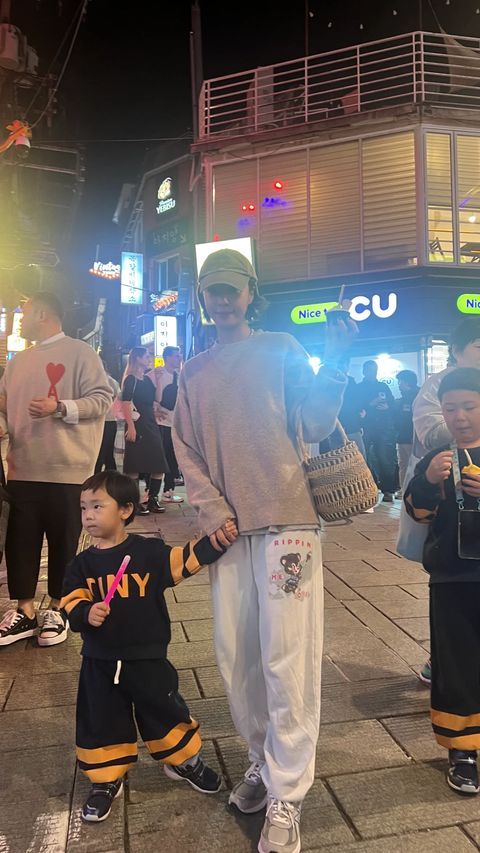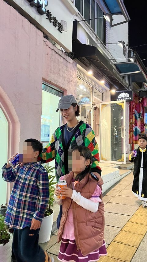 사진 속 황정음은 번화가에서 아이들을 데리고 포즈를 취하고 있다.