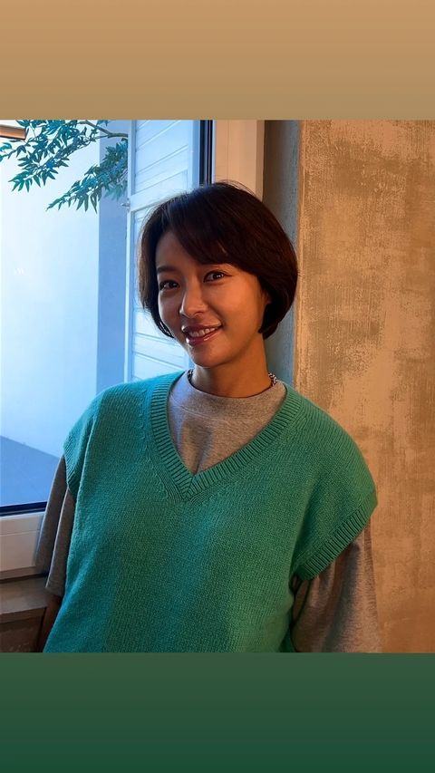 편안하면서도 가을 느낌이 물씬 풍기는 옷차림을 하고 부드러운 미소를 지었다.
