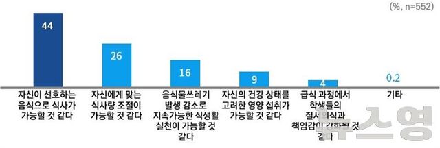 미운영교 학생들은 자율선택급식 도입 시 기대되는 점으로 △선호하는 음식으로 식사 가능(44%) △자신에게 맞는 식사량 조절 가능(26%) 순으로 답했다.