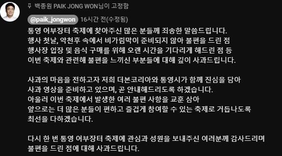 백 대표는 “다시 한 번 통영어부장터 축제에 관심과 성원을 보내주신 여러분께 감사드리며 불편을 드린 점에 대해 사과드린다”고 했다.