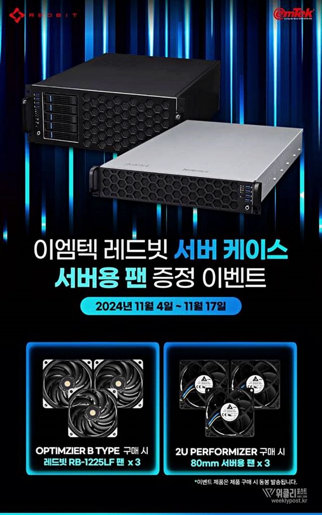 고성능 렌더링 서버, Ai 딥러닝 머신, 워크스테이션 R&D 연구 기술 개발 및 제조사 이엠텍아이엔씨가 레드빗 브랜드의 4U 랙마운트 서버 케이스 이엠텍 레드빗 OPTIMIZER B TYPE 제품 구매 시, 이엠텍 레드빗 RB-1225LF 팬 3개, 이엠텍 레드빗 PERFORMIZER 제품 구매 시, 80mm 서버용 팬 1개를 11월 4일부터 17일까지 증정하는 프로모션을 진행한다.