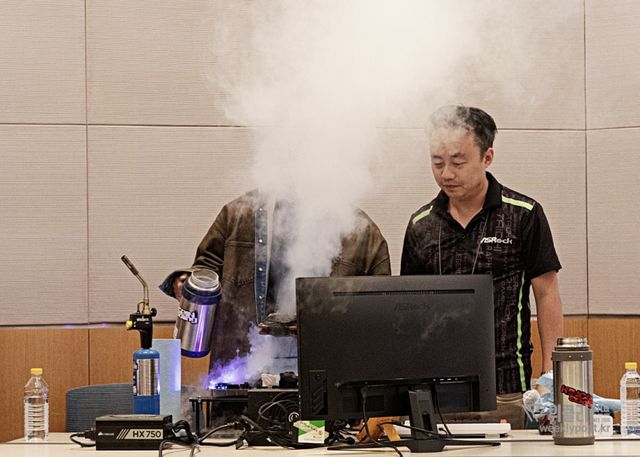 2부에서는 오버클러커 Nick Shin과 오버클러커 BisoBiso를 초대해 ASRock 타이치 OCF 메인보드와 인텔 코어 울트라9 285K CPU를 사용한 질소 냉각 오버클러킹 시연을 선보였다. OCF 메인보드에서만 지원하는 질소 냉각 전용 모드 LN2 설정을 활성화해 온도를 영하 10도 이하로 떨어뜨리는 방식으로 P코어 6.0GHz, E코어 5.5GHz에서 시작해 클럭을 최대 6.3GHz와 5.8GHz까지 안정화하는 과정을 선보였다.